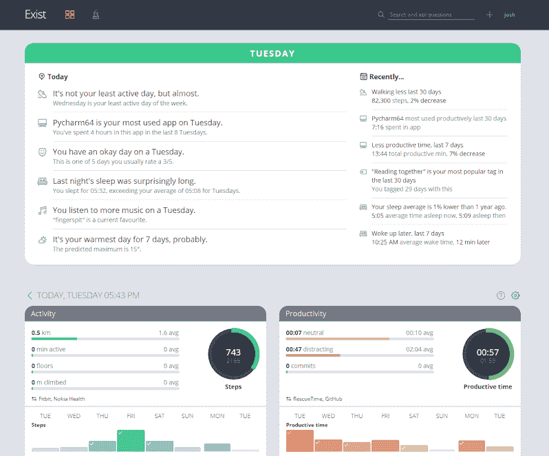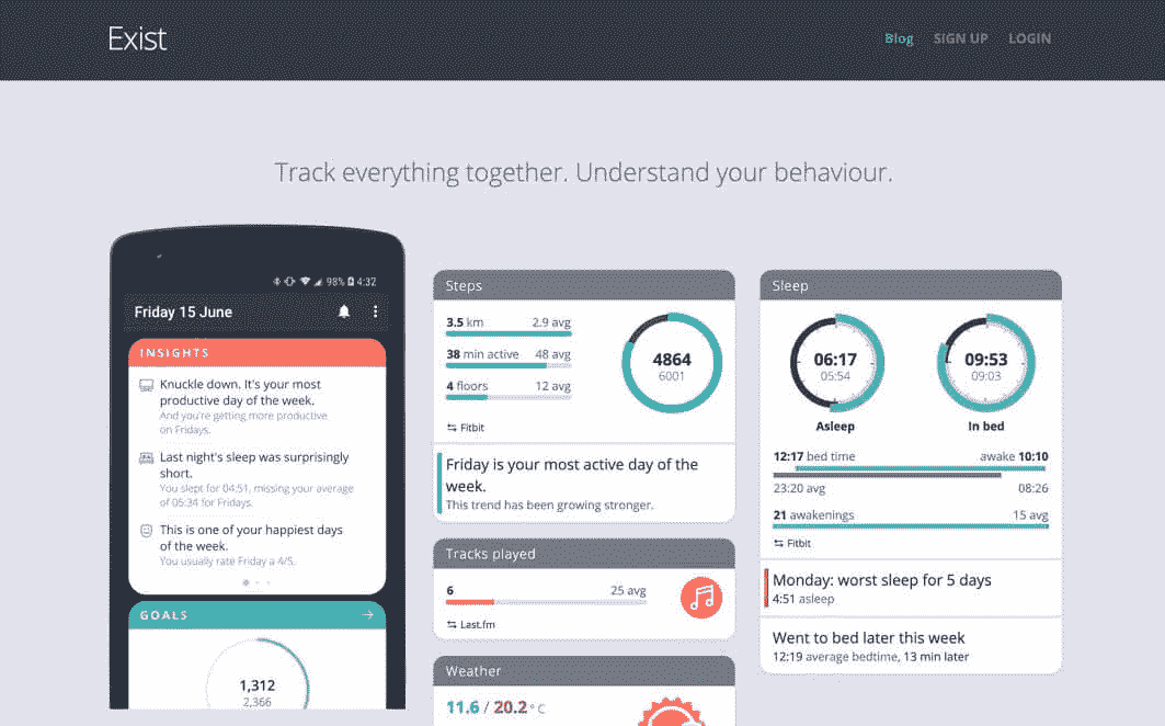 Exist 合并所有你用的服务中的数据(想想 Fitbit 、Apple Watch 、GitHub 、Twitter 等等),提供个人分析服务,从数据中找到你可能还没有发觉的趋势和关连。