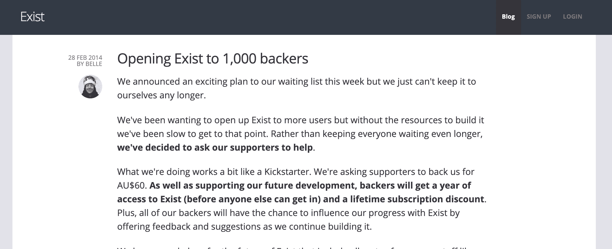 在 2014 年初,我们对进展缓慢感到很沮丧,因为 Exist 必须迁就我们的主职工作。在 2014 年 2 月,我们进行了一次众筹来资助我们的发展并找到了第一批付费用户。支持者可以用比正式发布后低的价格预购年度订阅,我们也希望能筹集到足够支持我们两个全职做 Exist 6 个月时间的资金。我们没有达成这个目标,但是我们确实获得了足够多对我们想法的认可和继续下去的动力。