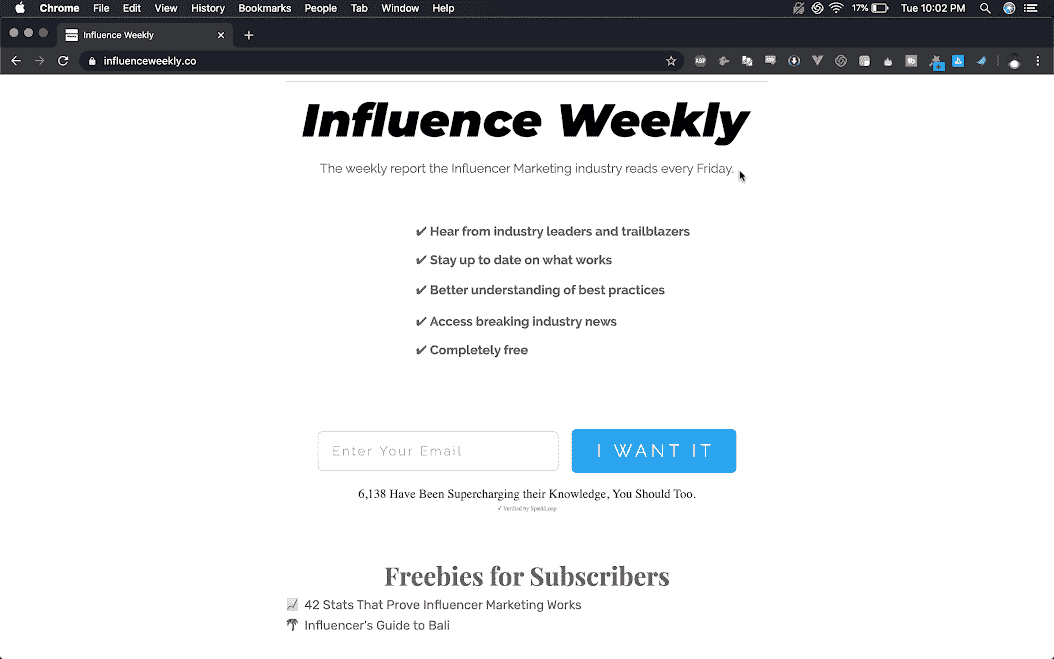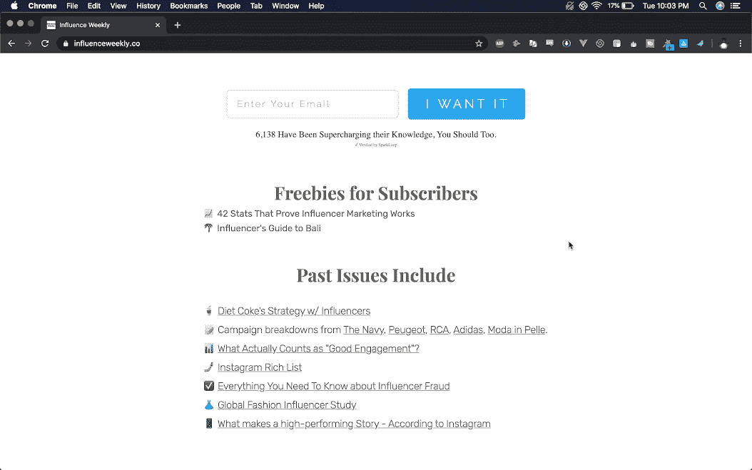 Influence Weekly 是关于网红营销的订阅邮件,创始人 Andrew Kamphey 本身是业内人士,把自己的阅读内容和时事资讯整理成周报,做出了这个产品。