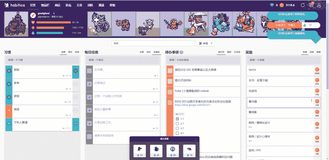 它是一个游戏化的任务管理工具。支持建立习惯,循环任务,以及普通任务。可以通过完成待办事项,获得金币,更强力的装备,宠物和坐骑。装备和等级的提升,可以让你更容易击败副本 Boss。而金币是这个游戏的一种虚拟货币,你可以自己用它“奖励”自己,比如要半小时游戏,就主动扣掉 100 金币,或者攒够 3000 金币,就给自己买个新手机。这些金币都是你努力工作得来的,这样你奖励自己,也就更加心安理得,更加愿意努力工作,你不知不觉间,就变成更好的自己。